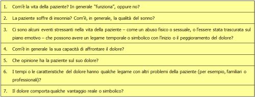 Quando si formulano domande su eventuali eventi stressanti, è assolutamente cruciale capire se ci sia un qualche legame temporale e/o simbolico con l’inizio o la localizzazione del dolore.
