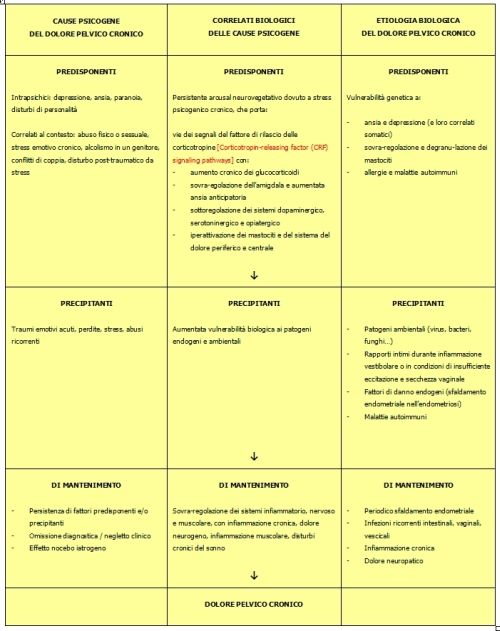 Figura 1. Lettura schematica di come i fattori psicogeni predisponenti, precipitanti e di mantenimento del dolore pelvico cronico possano progressivamente modificare la vulnerabilità biologica ai patogeni ambiental o alle noxae endogene, incluse quelle autoimmuni