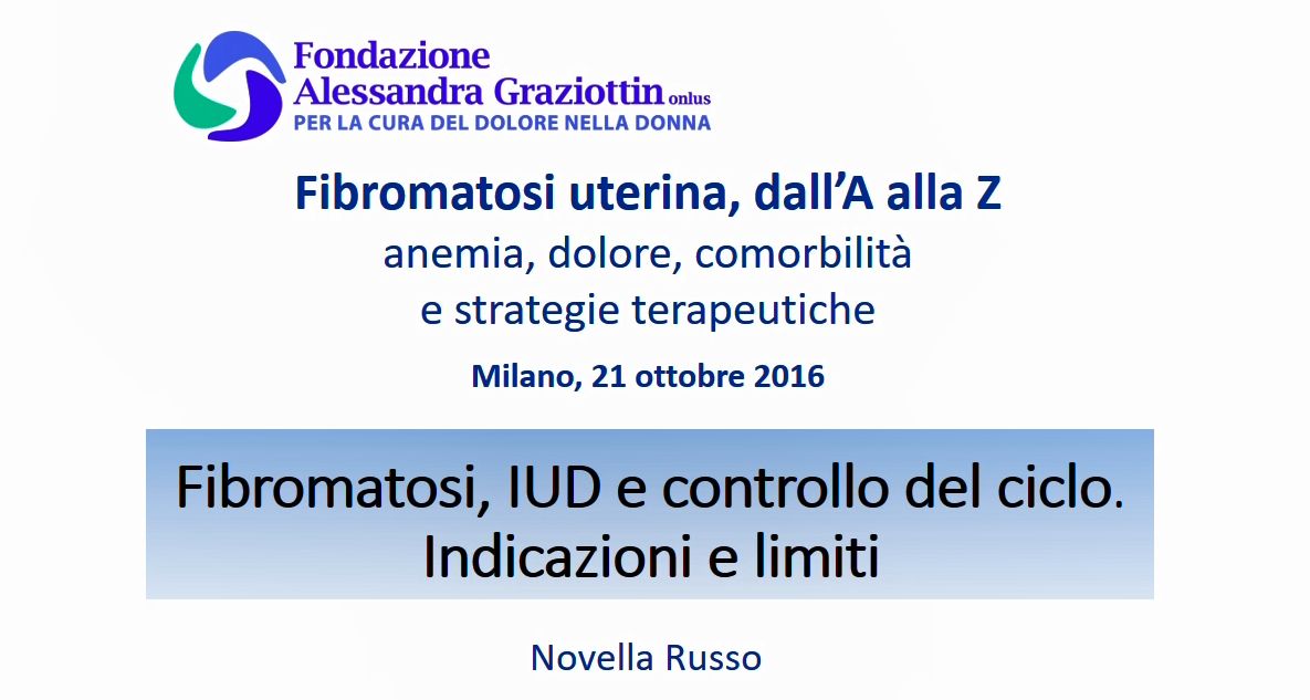 Russo N. Fibromatosi, IUD e controllo del ciclo. Indicazioni e limiti Graziottin A. (a cura di), Atti e approfondimenti di farmacologia del corso ECM su "Fibromatosi uterina, dall'A alla Z", organizzato dalla Fondazione Alessandra Graziottin per la cura del dolore nella donna Onlus, Milano, 21 ottobre 2016, p. 60-64