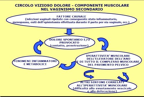 Il vaginismo può essere presente da sempre nella vita della donna (vaginismo primario), oppure insorgere in un determinato momento della vita (vaginismo secondario o acquisito) a causa di vari fattori (infezioni vaginali ripetute con conseguente stato infiammatorio, esiti dell’episiotomia effettuata durante il parto per via vaginale, secchezza vaginale dopo la menopausa con paura del dolore e/o di soffrire di cistiti post coitali, e così via). Soprattutto dopo l’episiotomia, è spesso presente anche dispareunia, definita come un “persistente o ricorrente dolore genitale durante i tentativi di penetrazione o durante la penetrazione completa vaginale nel rapporto sessuale” (Basson et Al. 2004); in questi casi si ammette che la componente muscolare e il dolore determinino un circolo vizioso, autoalimentandosi a vicenda (cfr. figura 1) (Everaert et Al. 2001).