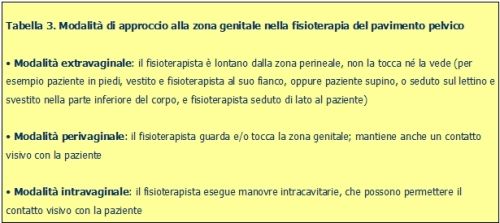 Inoltre per ogni fase il fisioterapista può utilizzare un diverso approccio alla zona genitale (Tab. 3), scegliendo se osservare e/o toccare questa parte, ai fini di favorire nella donna una condizione più confortevole e meno imbarazzante (Fig. 3).
