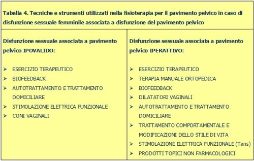 La fisioterapia del pavimento pelvico è un’opzione terapeutica indirizzata a questa condizione muscolare. Data la sua ridotta invasività, e la scarsità di effetti collaterali e di controindicazioni, può essere considerata un’efficace terapia in caso di disfunzioni sessuali femminili accompagnate da disfunzione muscolare del pavimento pelvico, all’interno di una condotta diagnostico-terapeutica di tipo multidisciplinare.