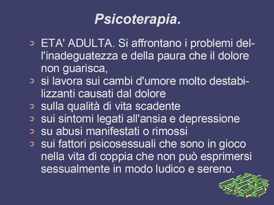 Micheletti C. La psicoterapia nel dolore vulvare Graziottin A. Murina F. (a cura di), Atti e approfondimenti di farmacologia del corso ECM su "Il dolore vulvare dall'A alla Z: dall'infanzia alla post-menopausa", organizzato dalla Fondazione Alessandra Graziottin per la cura del dolore nella donna Onlus, Milano, 7 aprile 2017, p. 97-99