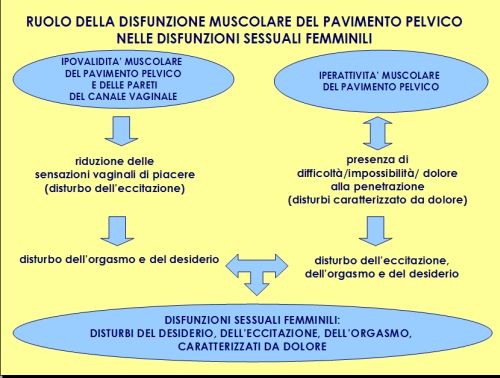 La disfunzione sessuale può essere causata da diversi fattori, tra i quali quello muscolare; più precisamente la disfunzione muscolare del pavimento pelvico può essere causa, concausa o può sostenere la disfunzione sessuale in atto. Tale condizione si può esprimere con uno stato sia di ipovalidità muscolare, sia di iperattività muscolare.