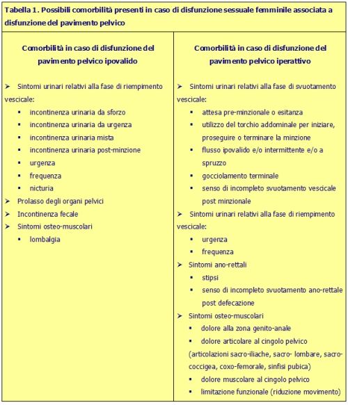 Nelle pazienti con disfunzione sessuale correlata ad ipoattività, il tono e il trofismo si presentano ridotti, così come i parametri muscolari dell’attività motoria volontaria (forza ed endurance). Nei soggetti con disfunzioni sessuali correlate ad iperattività, il tono si presenta aumentato, mentre i parametri muscolari possono variare: frequentemente le pazienti non sono in grado di attivare volontariamente il muscolo elevatore dell’ano e, quando possibile, tale attività appare ridotta; inoltre il rilassamento di tale muscolo, valutato come la capacità di ritornare alla condizione precedente alla contrazione, appare impossibile o fortemente ridotto. Ciò potrebbe essere correlato alla presenza di dolore, che agisce come fattore inibente l’attività motoria.