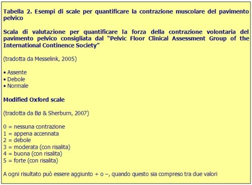 A tutt’oggi la valutazione dell’attività motoria del pavimento pelvico viene indicata attraverso scale di valutazione specificatamente elaborate o indicate da Società Scientifiche (Tab. 2).